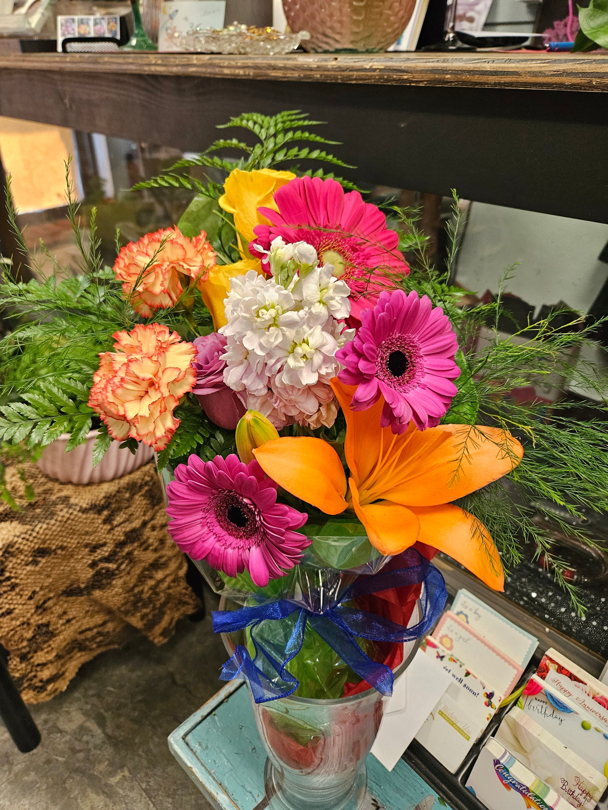 To guarantee the freshest bouquet possible, we may replace some stems in your arrangement for color or flower variety. While we always do the best to match the picture shown, sometimes different vases may be used. Any substitution made will be similar to the original design and be of equal or greater value.