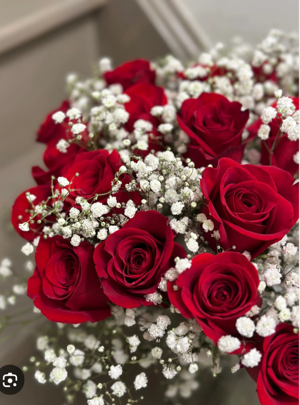 12 red roses wrapped with decorative festive filler